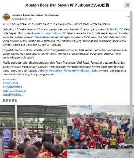 この事業では、「Sekolah Menengah Kebangsaan Pantai(SMKパンタイ国立中学校)」と「SK Pekan Satu, WP Labuan(SKペカン第1小学校)」の各学校の生徒とのフットボール交流事業、さらにマレーシアラブアン連邦青年スポーツ部が主催するフットボールクリニックを実施しました。 事業を実施した結果、現地メディアに取り上げられただけでなく、行政関係者や学校関係者から大きな反響があり、継続的な実施を望む声や未実施校から多数の実施要請を受けました。今後も日本のスポーツ指導者の派遣や海外の子どもたちとの交流事業を通じて、性別、年齢、文化、宗教に関わらず、人と人、人と社会がスポーツによってつながる国際人材交流に取り組みます。